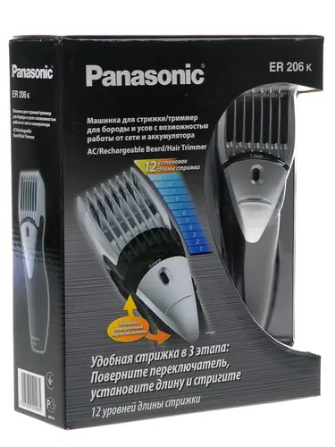 Триммер Panasonic ER 206 – это надежное устройство, призванное стать верным помощником каждого мужчины. С помощью этого триммера Вы сможете максимально удобно и быстро осуществлять стрижку бороду, придавая ей ту форму и вид, которые Вам необходимы. Оснащенный мощным двигателем, данный прибор выдает скорость стрижки до 30 0000 волос/сек. Устройство обладает эргономичным и стильным дизайном. Лезвия, используемые в работе Panasonic ER 206, сделаны из высококачественной нержавеющей стали, и обеспечивают отличную скорость и точность бритья.