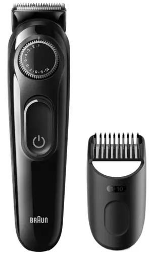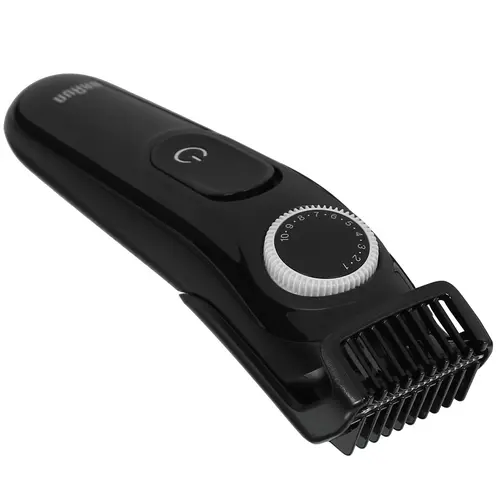 Триммер в черном корпусе позволит самостоятельно подравнивать усы и бороду. Комплектная насадка располагает 20 установками длины, благодаря чему вы сможете выбрать оптимальное значение в диапазоне от 0.5 до 10 мм. Острые лезвия из нержавеющей стали справляются со срезанием самого жесткого и густого волоса за один проход устройства по коже. Триммер работает автономно от аккумулятора, который гарантирует 50 минут непрерывного функционирования. Для удобного хранения и возможности брать прибор с собой куда угодно в комплекте поставки есть футляр.