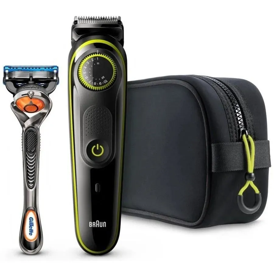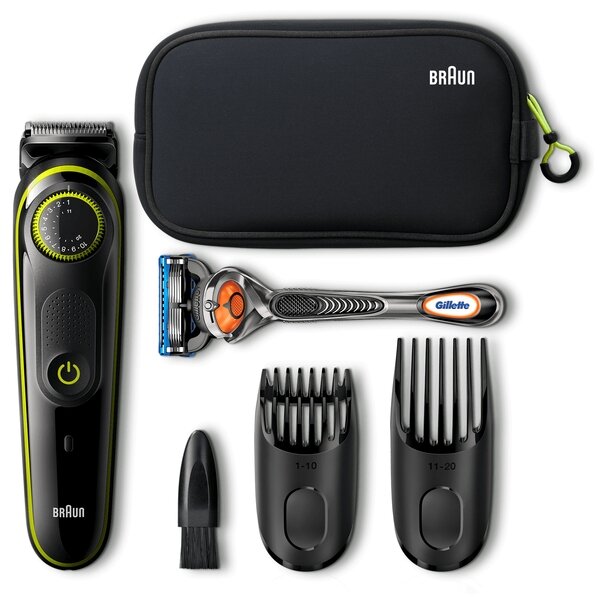 комплектация: триммер, насадка гребень 2 шт (1-10 мм и 11-20 мм), бритва Gillette Fusion 5 ProGlide с технологией FlexBall, щеточка для очистки, сумка для транспортировки