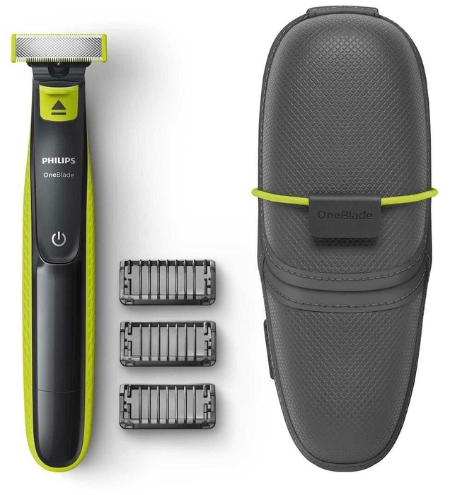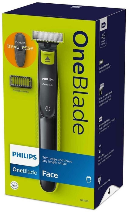 - двустороннее лезвие, влажное и сухое бритьё, подравнивание щетины, бритьё щетины, создание контуров, гребни для подравнивания 1, 3 и 5 мм; срок службы сменного лезвия до 4 месяцев; адаптер