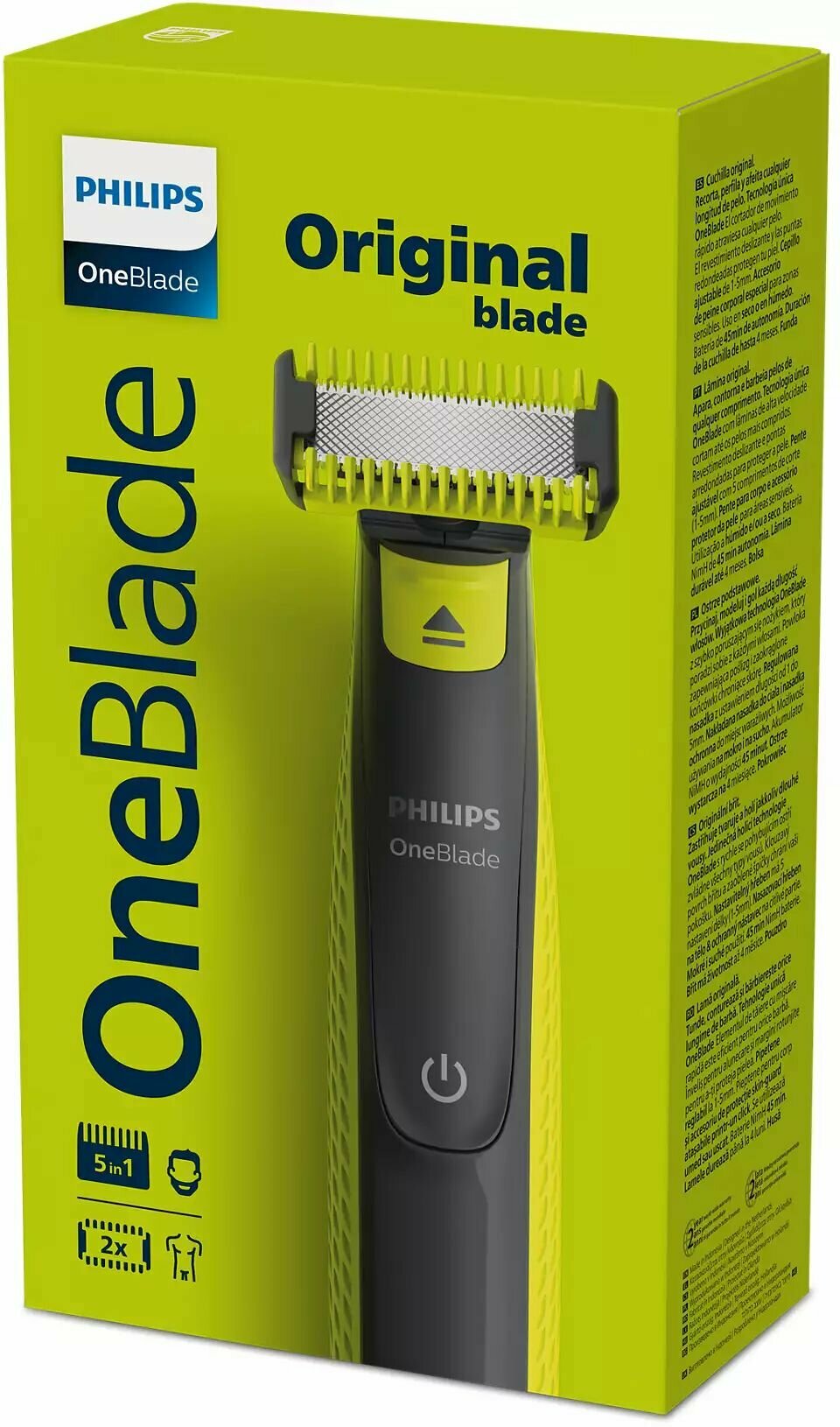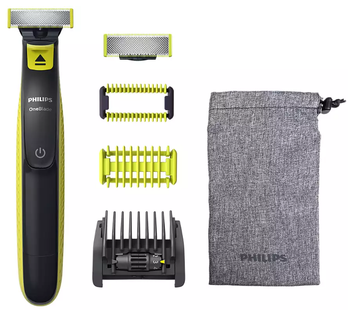 Комплектация: триммер, два лезвия — для лица и для тела, защитная насадка, насадка-гребень для тела, регулируемый гребень «5 в 1», мягкий чехол