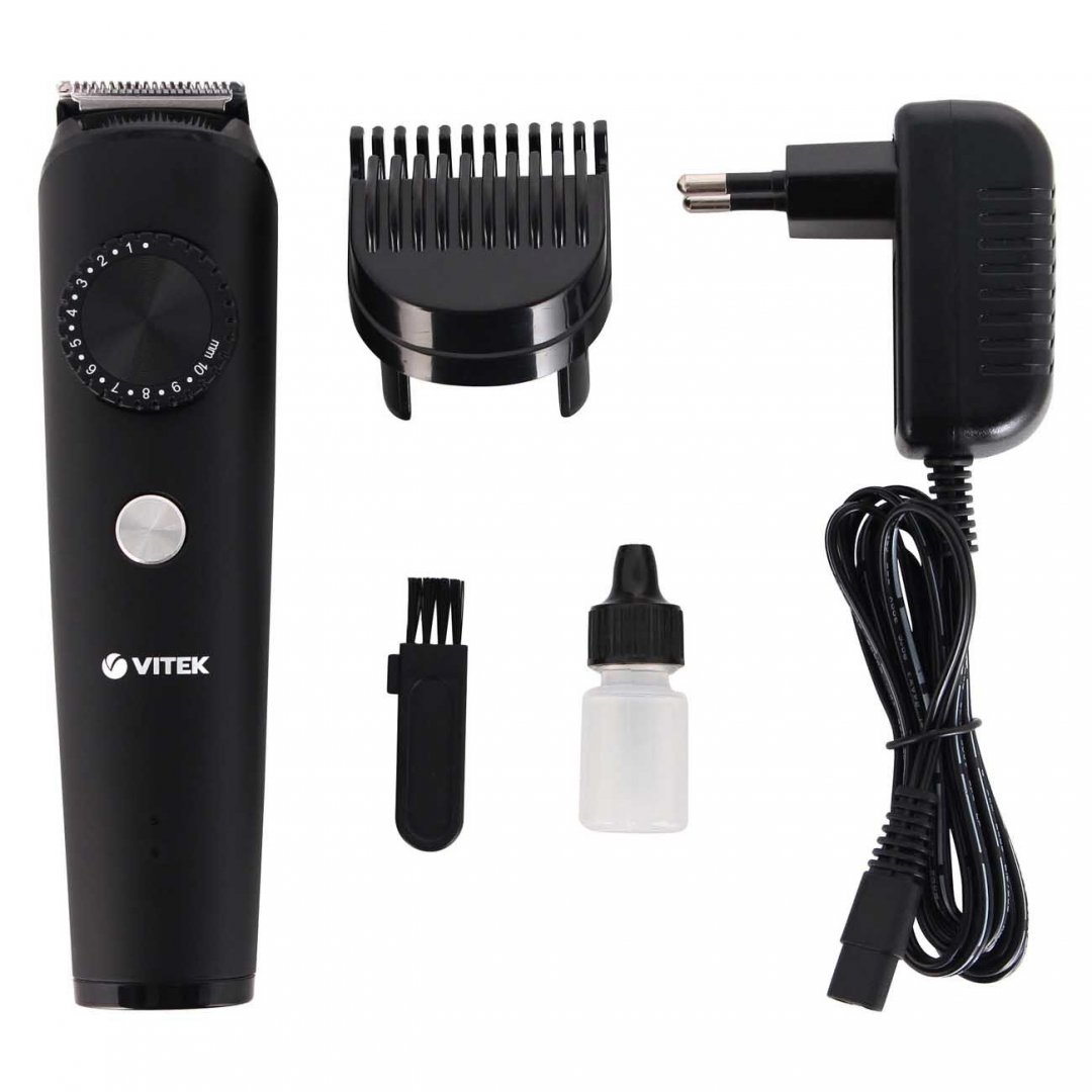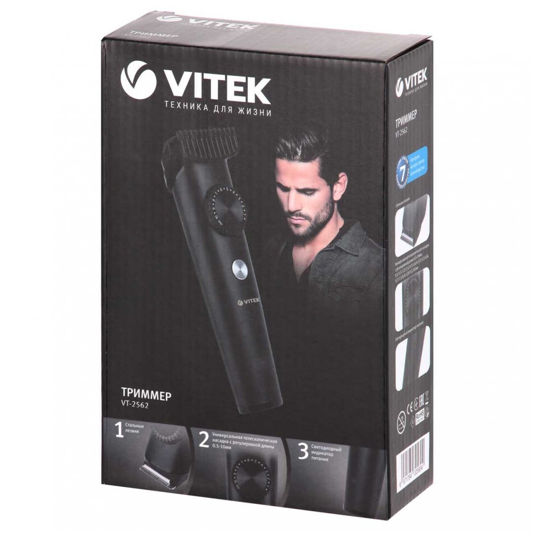 Триммер для усов и бороды VITEK VT-2562 подходит для использования дома или в поездках. Устройство удобно брать с собой благодаря компактному размеру — оно помещается в сумке и чемодане. Триммер функционирует от сети, а также от аккумулятора. Заряда хватает на час автономной работы.