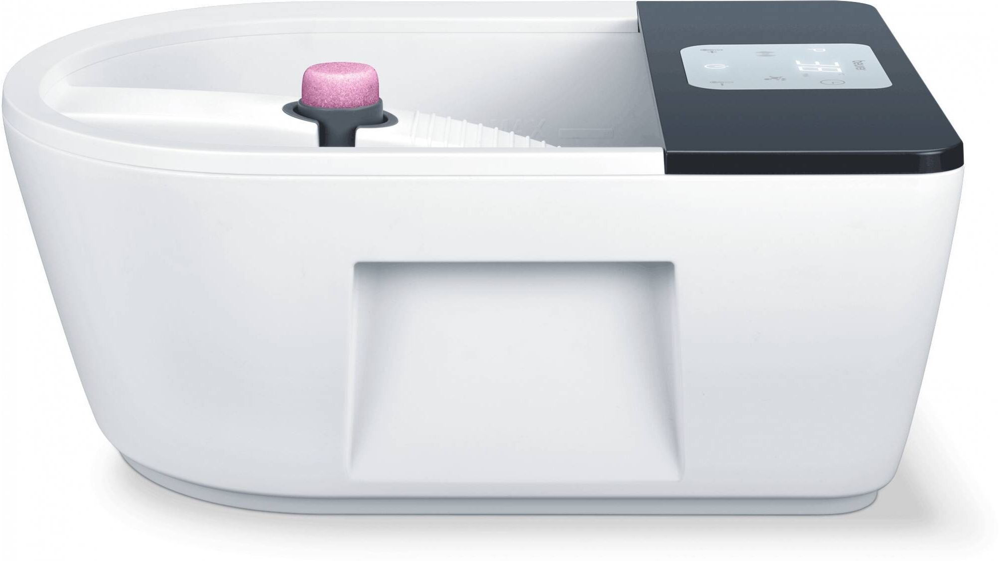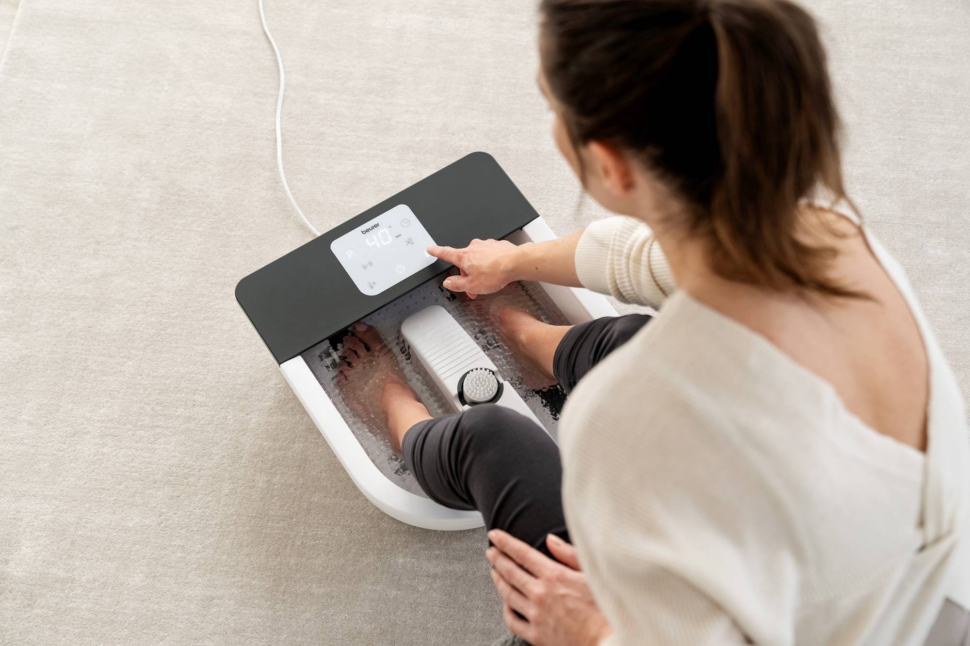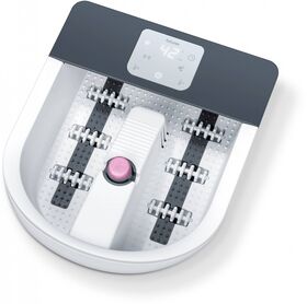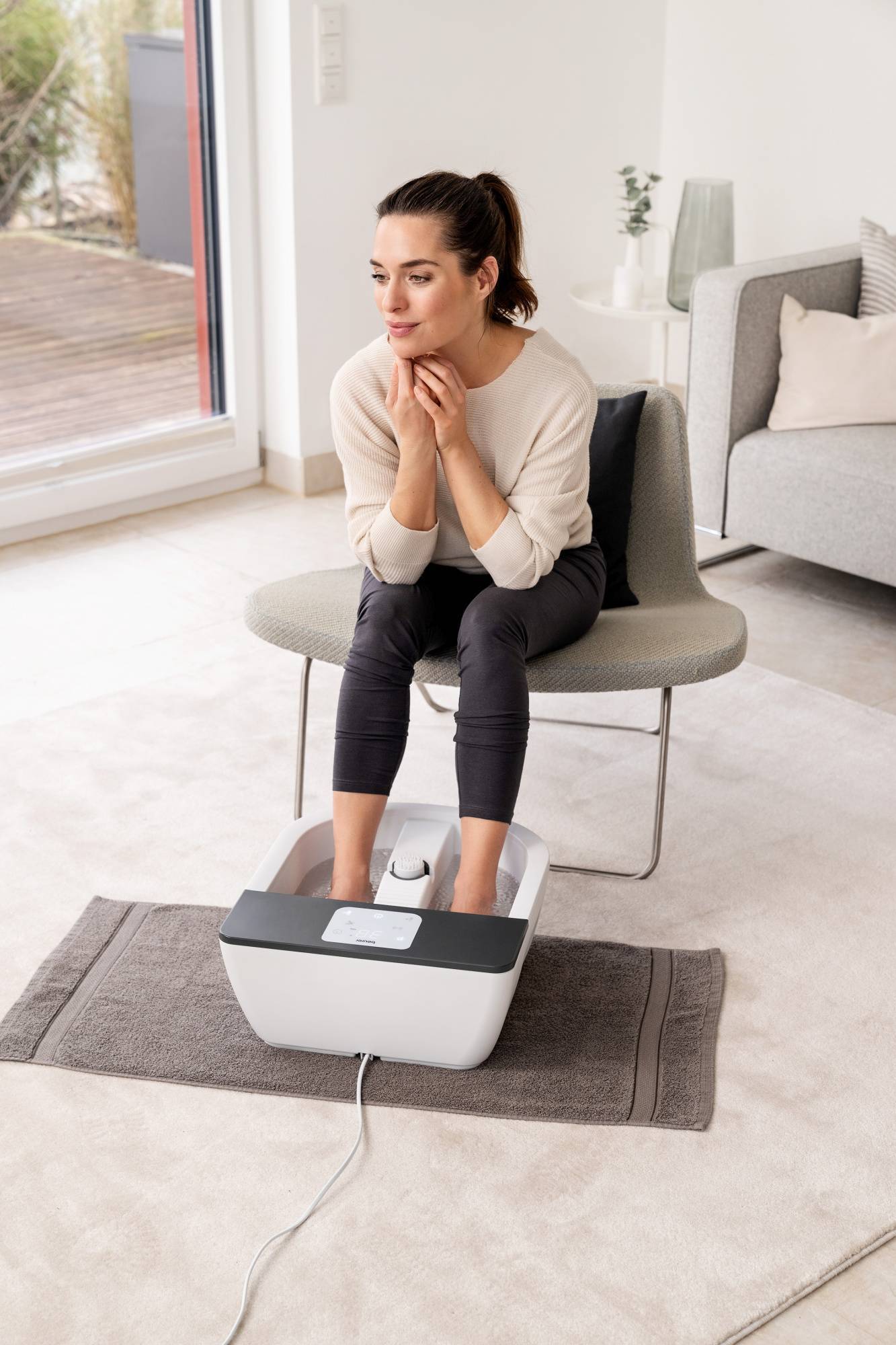 Двойные стенки для улучшенной теплоизоляции. Рельефные поверхности и очень широкие ролики для расслабляющего массажа нижней стороны стоп. Нескользящие резиновые ножки с механизмом намотки кабеля. Можно использовать до размера обуви 51