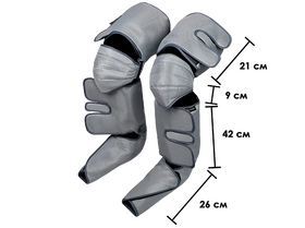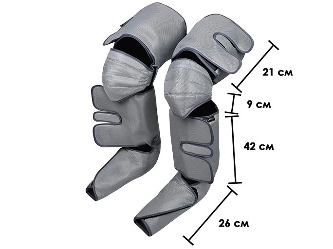 Отличительной особенностью является большая длина манжет, позволяющая провести комплексную прессотерапию и лимфодренаж в области бедер, икроножных мышц, лодыжек и стоп одновременно. Благодаря липучкам на манжетах достигается плотное обертывание и прилегание.
