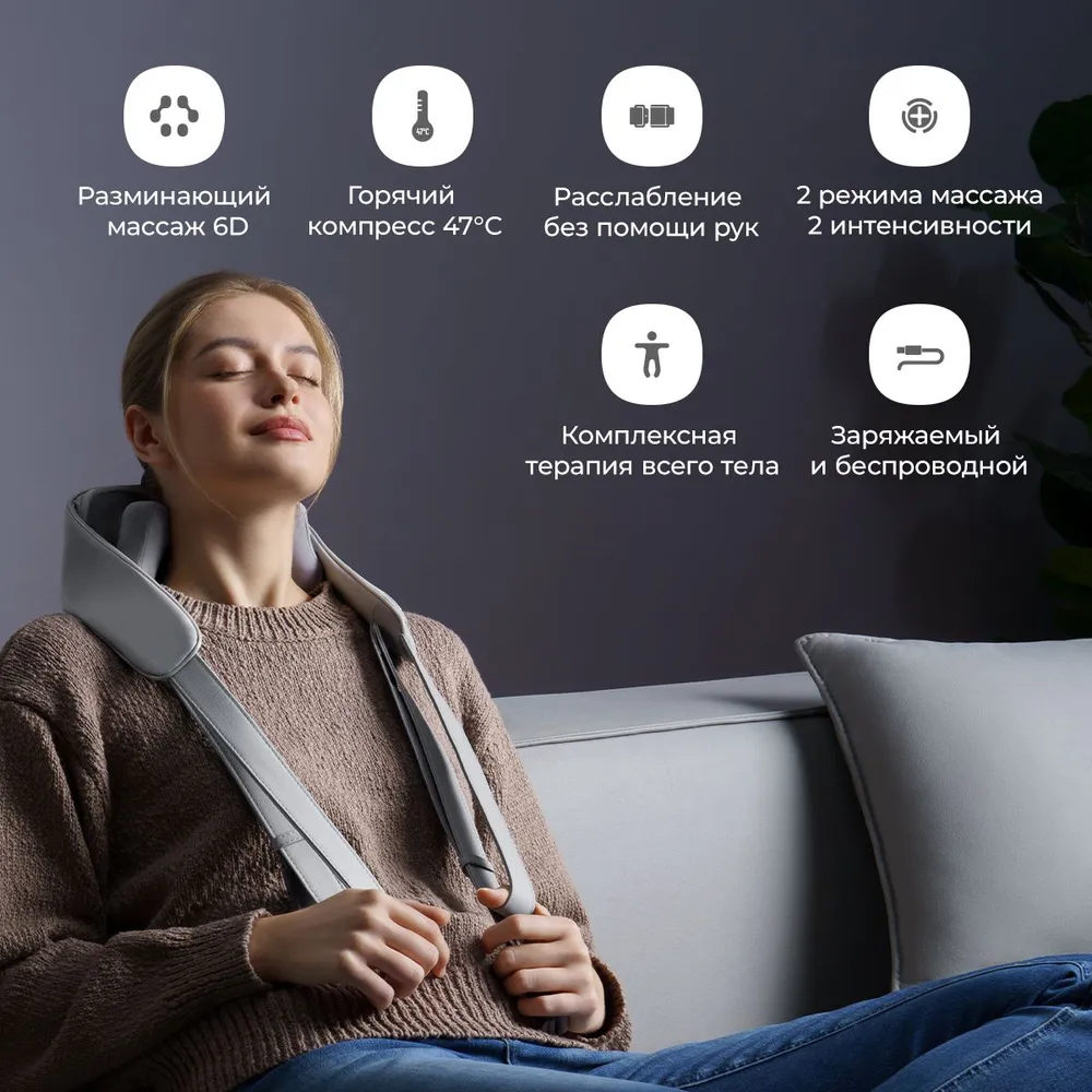Массажер для шеи Yunmai.Устраняет дискомфорт в шее и спине благодаря инновационной технологии с применением разогрева.Массажер для шеи Yunmai оснащен передовыми 6D массажными насадками, которые имитируют руки профессионального массажиста, обеспечивая профессиональное, глубокое разминание, позволяющее глубоко проработать мышцы лодыжек, шеи и плеч, обеспечивая полное расслабление.
