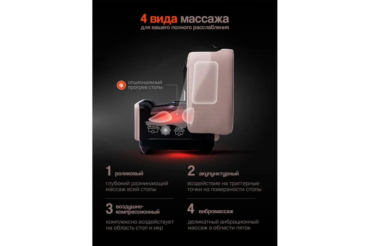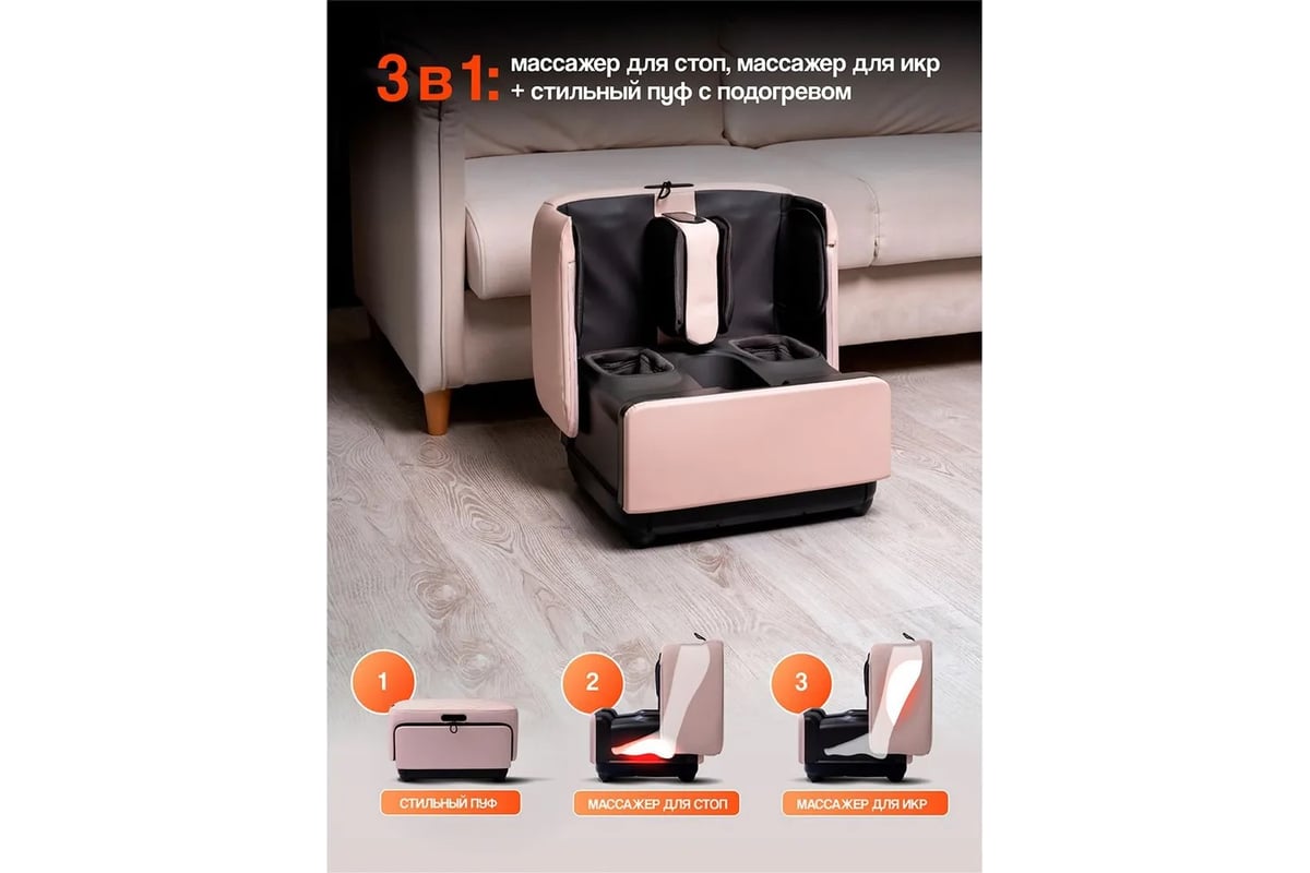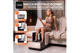 Массажер для ног GESS PUF бежевый GESS-101 biege для стоп и икр для комплексного воздействия на ноги. Способствует снятию напряжения в мышцах, прорабатывает все важные акупукнтурные точки. Массажер для ног в сложенном виде имеет форму пуфика, он не будет выделяться, его можно хранить на видном месте и использовать как отдельный предмет интерьера. Объединяет в себе три важных функции: массаж стоп, лимфодренаж и удивительно удобное место для отдыха. Массажер для ног с несколькими видами массажного воздействия: роликовый, акупунктурный, воздушно-компрессионный и вибромассаж. Можно отдельно выбрать зоны массажа и настроить интенсивность воздействия. Массаж осуществляется воздушными подушками, акупунктурными аппликаторами и массажными роликами. У массажера PUF 5 автопрограмм, позволяющих выбрать именно тот вариант, который подходит в данный момент. Электрический массажер позволяет эффективно проработать стопы, глубоко промассировать икры, снять неприятные ощущения в ногах после длительного стояния или сидения. По желанию можно включить прогрев стоп или сидения (в сложенном виде). Это позволит сидеть на теплом пуфике, когда не используются массажные функции. Панель управления находится на корпусе прибора, что обеспечивает легкий доступ и настройку параметров массажа. Комплексное воздействие массажера способствует общему улучшению организма. Регулярные сеансы массажа способствуют улучшению сна, настроения и повышению общего тонуса. Подходит до 45 размера стоп.