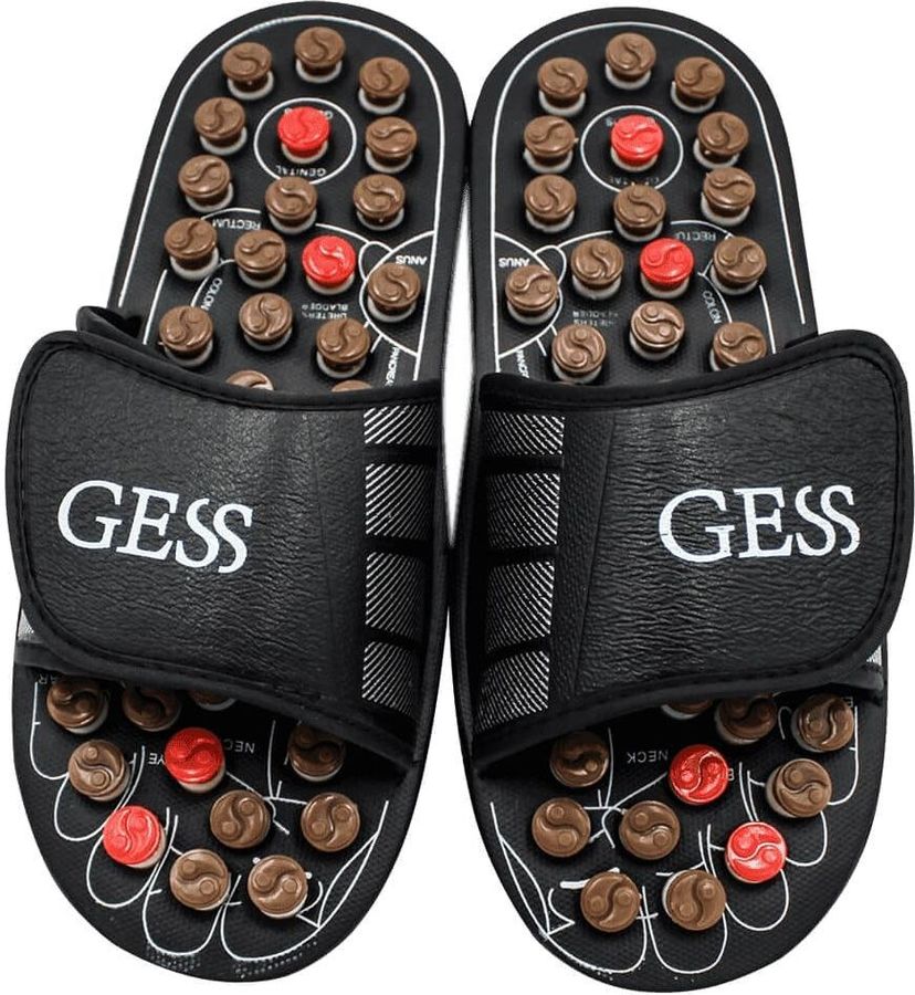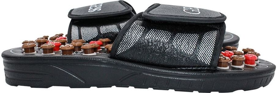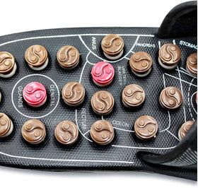 Массажер для стоп для акпунктурного массажа стоп. Массаж осуществляется пружинящими кнопками, которые при надавливании проворачиваются и массируют определённую точку. Акупунктурный массаж стоп. Снятие отечности и усталости, расслабление ног. Есть липучка для регулирования ширины тапочек.