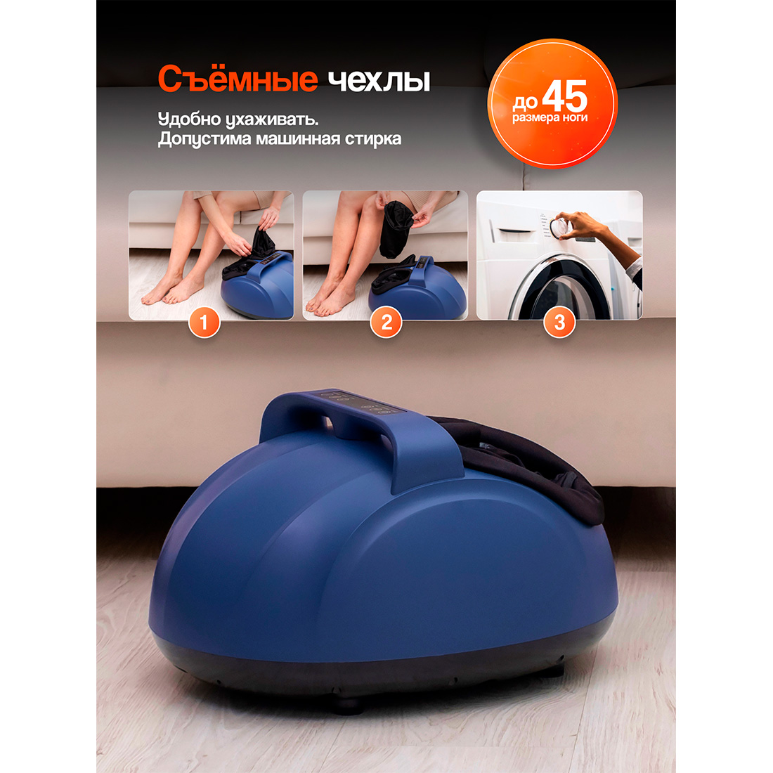 Устройство гигиенично в эксплуатации — съемные чехлы на молнии легко снять для стирки. Массажер для стоп подойдет до 45 размера ног, станет незаменимым помощником при болях в ногах, подошвенном фасциите, стоячей работе, занятиях бегом, танцами, ходьбе на высоких каблуках и в неудобной обуви.