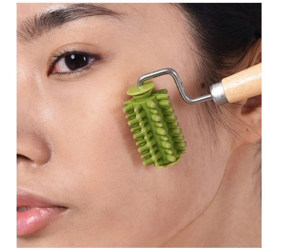 Ручной массажер для лица с небольшими шипами при регулярном использовании помогает улучшить цвет лица, повышает упругость и эластичность кожи, уменьшает отёчность. С помощью косметического массажера можно сделать приятный и полезный акупунктурный массаж. Массажный ролик можно использовать как с привычными вам косметическими средствами, так и по сухой чистой коже. С лифтинг массажером легче поддерживать здоровый цвет и красивый овал. Массаж нужно проводить поступательными движениями снизу вверх, для лучшего эффекта использовать моделирующий массажер для лица нужно ежедневно по 10-15 минут. Он станет отличным дополнением к вашему уходу за собой. При загрязнении промойте массажер для лица теплой водой с мылом или другим нейтральным чистящим средством. Материал изделия: ручка – дерево, ролик - ТПР