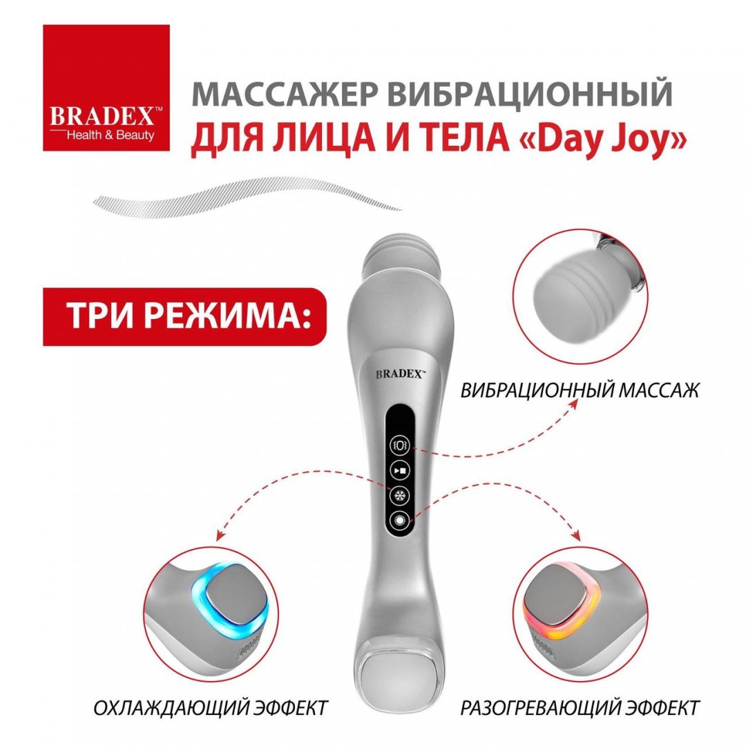 Вибромассажер для тела Bradex Day Joy KZ 1422 оснащен аккумулятором емкостью 2600 мА*ч, благодаря чему работает автономно. Устройство имеет режим инфракрасного прогрева, который обеспечивает эффект лифтинга и позволяет сохранить упругость кожи лица, шеи и зоны декольте. Программа крио-массажа служит для снятия отеков и сокращения расширенных пор. Деликатное воздействие вибрирующей головки оказывает антицеллюлитный эффект, стимулирует кровообращение и позволяет избавиться от чувства усталости.