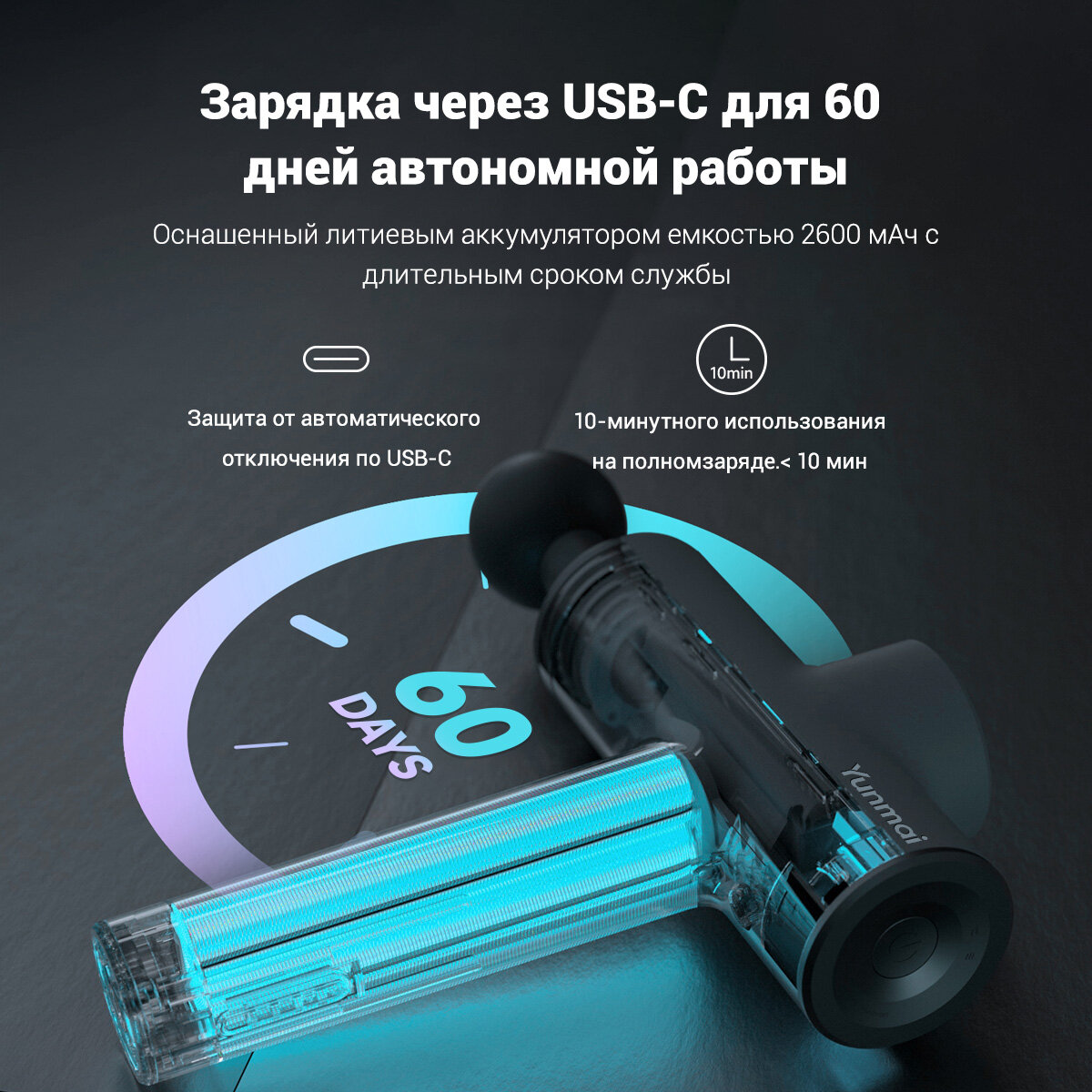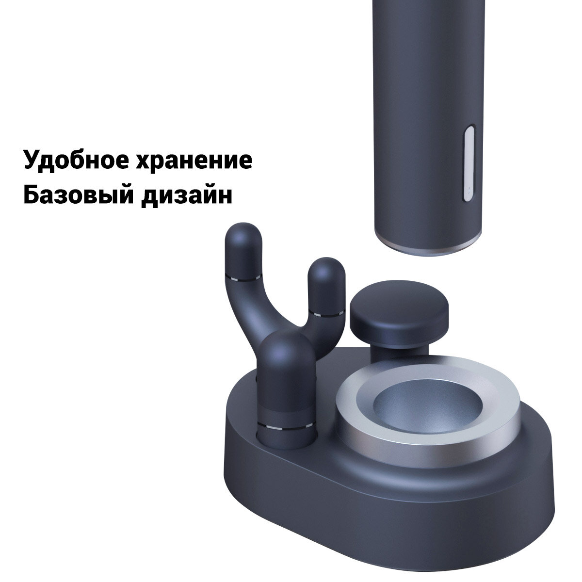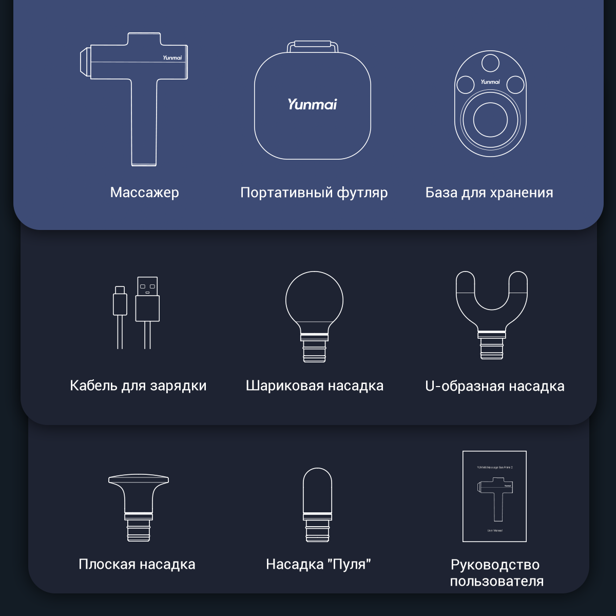 Массажер, зарядная док-станция, насадки: цилиндрическая, сферическая, плоская и U-образная, адаптер питания, кейс для хранения, руководство пользователя