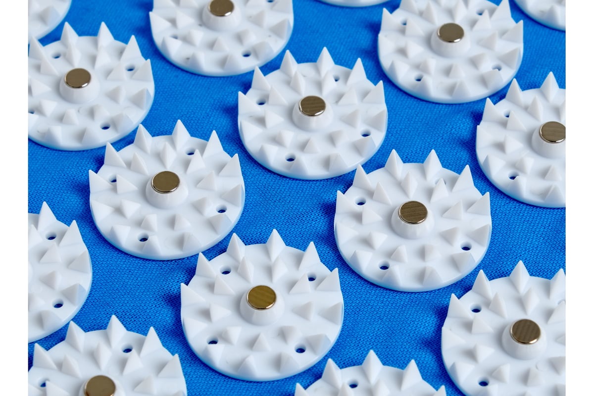 Действует по методу акупунктуры с помощью острых акупунктурных шипов, расположенных на тканой хлопковой основе.