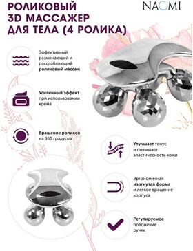Эффективный разминающий и расслабляющий роликовый массаж. 4 круглых ролика с 3D гранями для дополнительного массажного эффекта. Вращение роликов на 360°. Улучшает тонус и повышает эластичность кожи. Усиленный эффект при использовании крема.