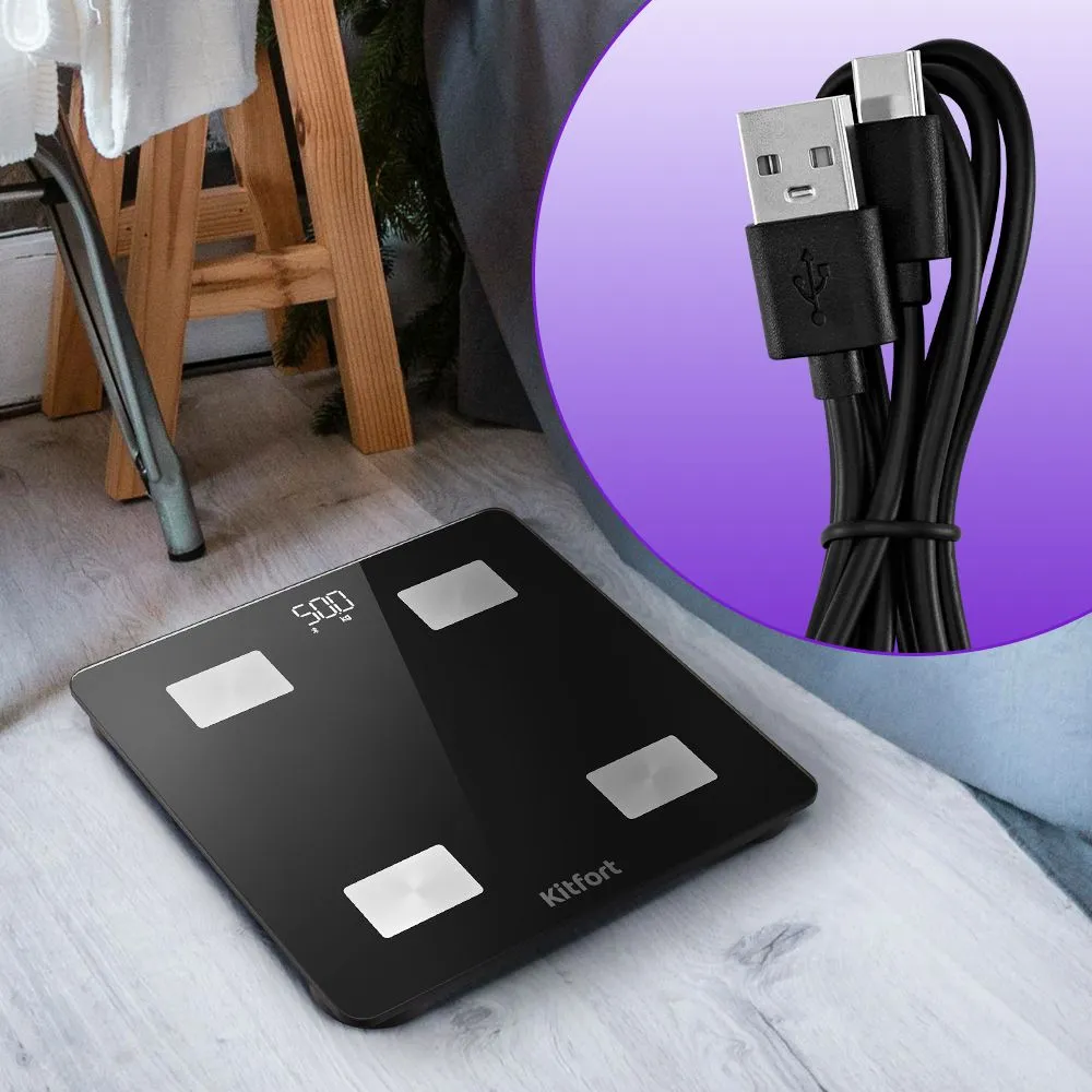 Весы работают от аккумулятора, шнур USB Type-C идёт в комплекте. Устройство имеет стильный и минималистичный дизайн, благодаря чему отлично впишется в любой интерьер.