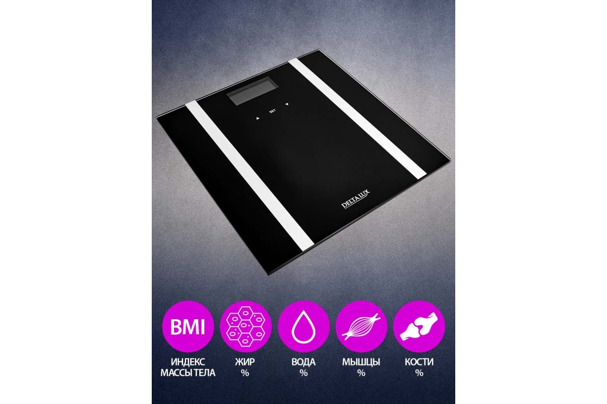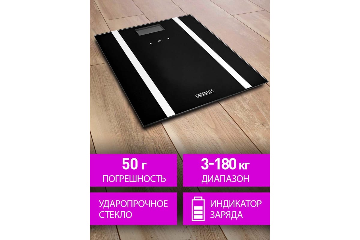 Весы напольные электронные DELTALUX DE-4600 SMART 180 кг черные Р1-00007199 используются для взвешивания человека, подойдут для бытового использования. Цифровой дисплей с автоматическим включением облегчает процесс эксплуатации весов. Диапазон измерений 3-180 кг.