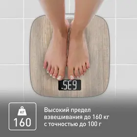 Весы Tefal PP1600V0 с пластиковым корпусом и стеклянной платформой украшены коричневым рисунком с имитацией текстуры дерева. Устройство выдерживает 160 кг, позволяя узнать вес взрослого человека. Точность измерений составляет 100 г, а полученные данные отражаются на дисплее большими цифрами.