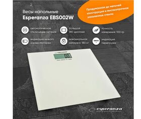 Напольные весы ESPERANZA Aerobic электронные в белой расцветке станут хорошим приобретением для человека, который следит за массой тела и здоровьем. Максимальная нагрузка для платформы из закаленного стекла составляет 180 кг при точности замеров до 100 г. Индикатор перегрузки просигнализирует, если этот порог превышен. Также весы оснащены индикацией низкого заряда батареи. Единица измерения веса: кг / фунт / ст. Устройство включается автоматически, как только пользователь встает на его поверхность. Весы ESPERANZA оснащены увеличенным ЖК-дисплеем 70х34 мм. Питание осуществляется от батареек типа CR2032 (в комплект не входят).