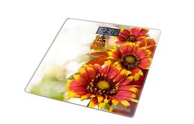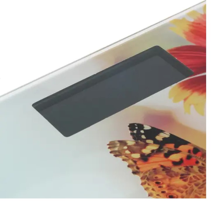Электронные напольные весы с платформой из полированного стекла, встроенной функцией индикации температуры помещения и крупным жидкокристаллическим дисплеем с легко читаемыми цифрами.