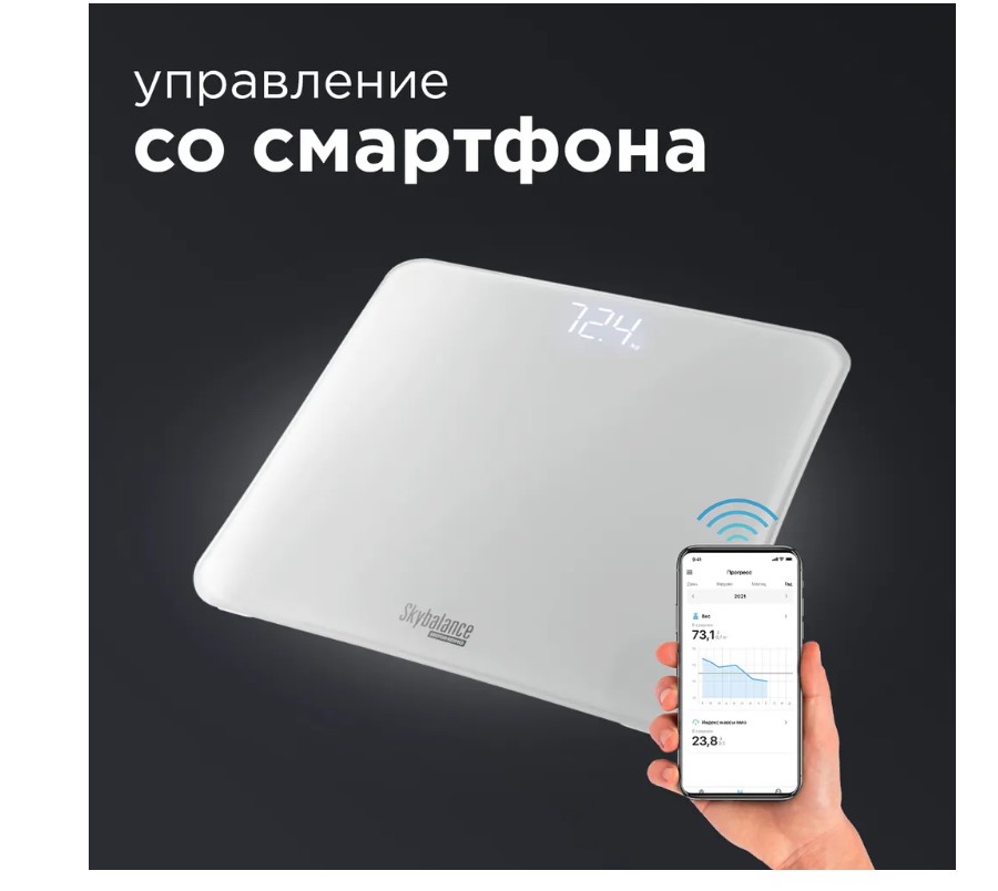 SkyBalance передает данные каждого взвешивания в мобильное приложение Ready for Sky. Программа сохраняет их и строит наглядный график изменений, а также рассчитывает индекс массы тела.