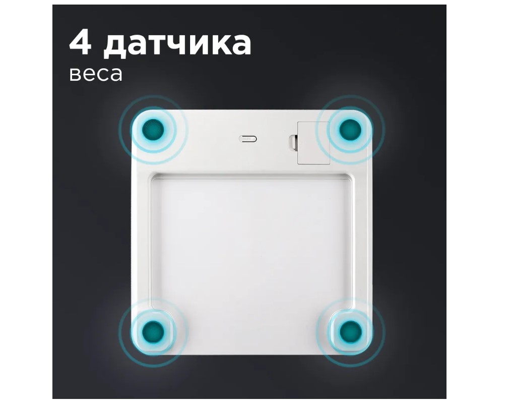Точность до 100 гИспользование 4 высокочувствительных датчиков позволяет определять вес в диапазоне от 5 до 180 кг с точностью до 100 грамм. Прибор может отображать данные в килограммах и фунтах, для переключения единиц измерения достаточно нажать кнопку на корпусе.