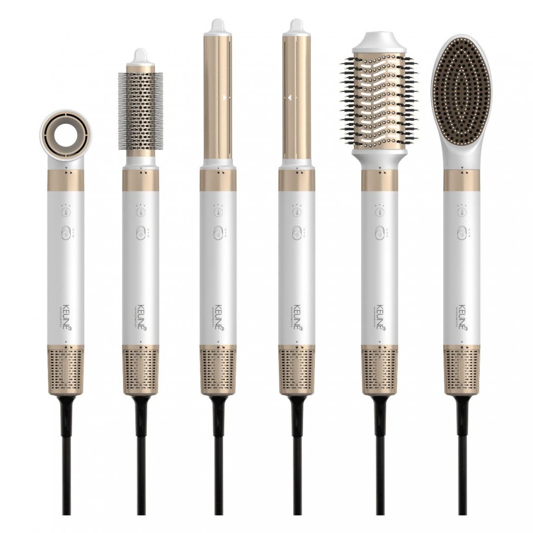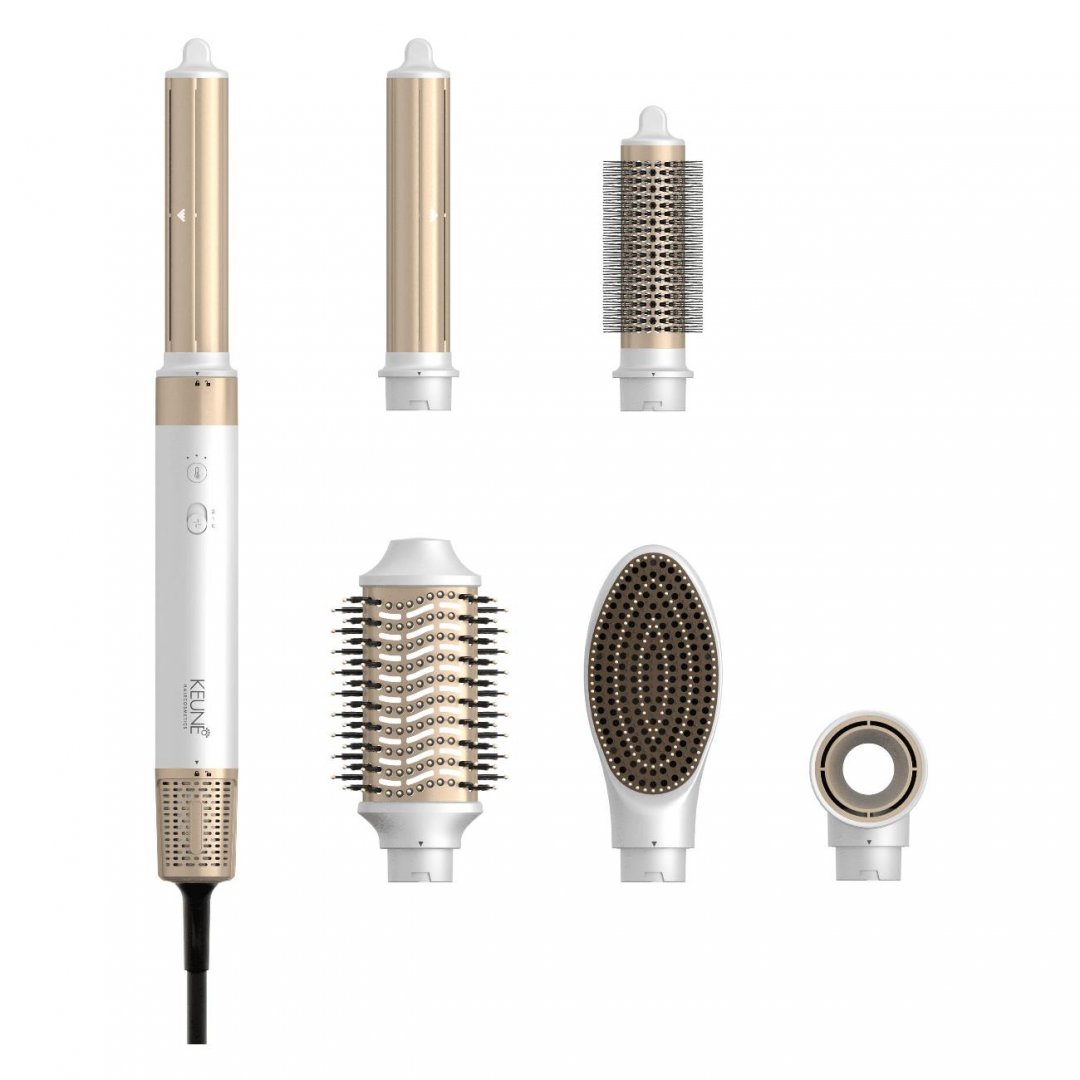Мультистайлер KEUNE MS-62C мощностью 1400 Вт имеет две рабочие скорости, три режима нагрева и ступенчатую регулировку температуры, что позволяет подобрать оптимальные условия для ухода за волосами любой структуры. В комплекте поставляется шесть сменных насадок. Это позволяет не только высушить волосы, но и создать стойкий прикорневой объем, сформировать мелкие кудри и пышные локоны. Функция ионизации предотвращает пересушивание и появление статического электричества.