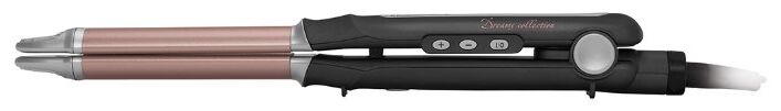 Описание: Турмалиновое покрытие генерирует ионы кислорода, которые благотворно воздействуют на волосы, снимают статическое напряжение, делая их послушными, здоровыми и естественно блестящими. 2 в 1: для выпрямления и завивки. LED терморегулятор, 6 режимов: 100-120-140-160-180-200°C. Размер 22 х 100 мм