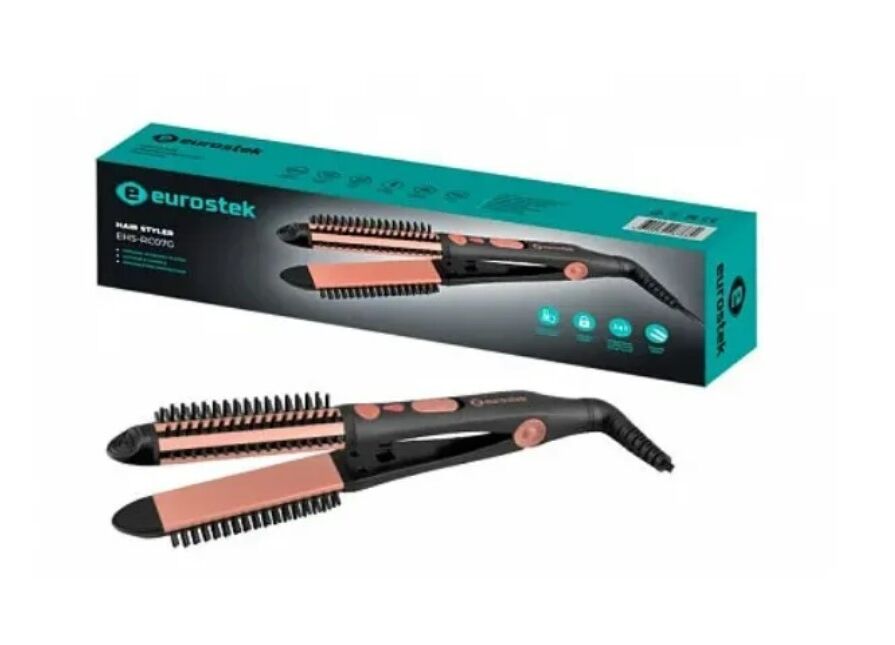Стайлер для волос 3 в 1 Eurostek EHS-RC07G включает в себя три функции: выпрямление, завивка, укладка. Пластины с керамическим покрытием имеют размер 32x107 мм. Поворот шнура на 360° позволяет избежать перекручивания.