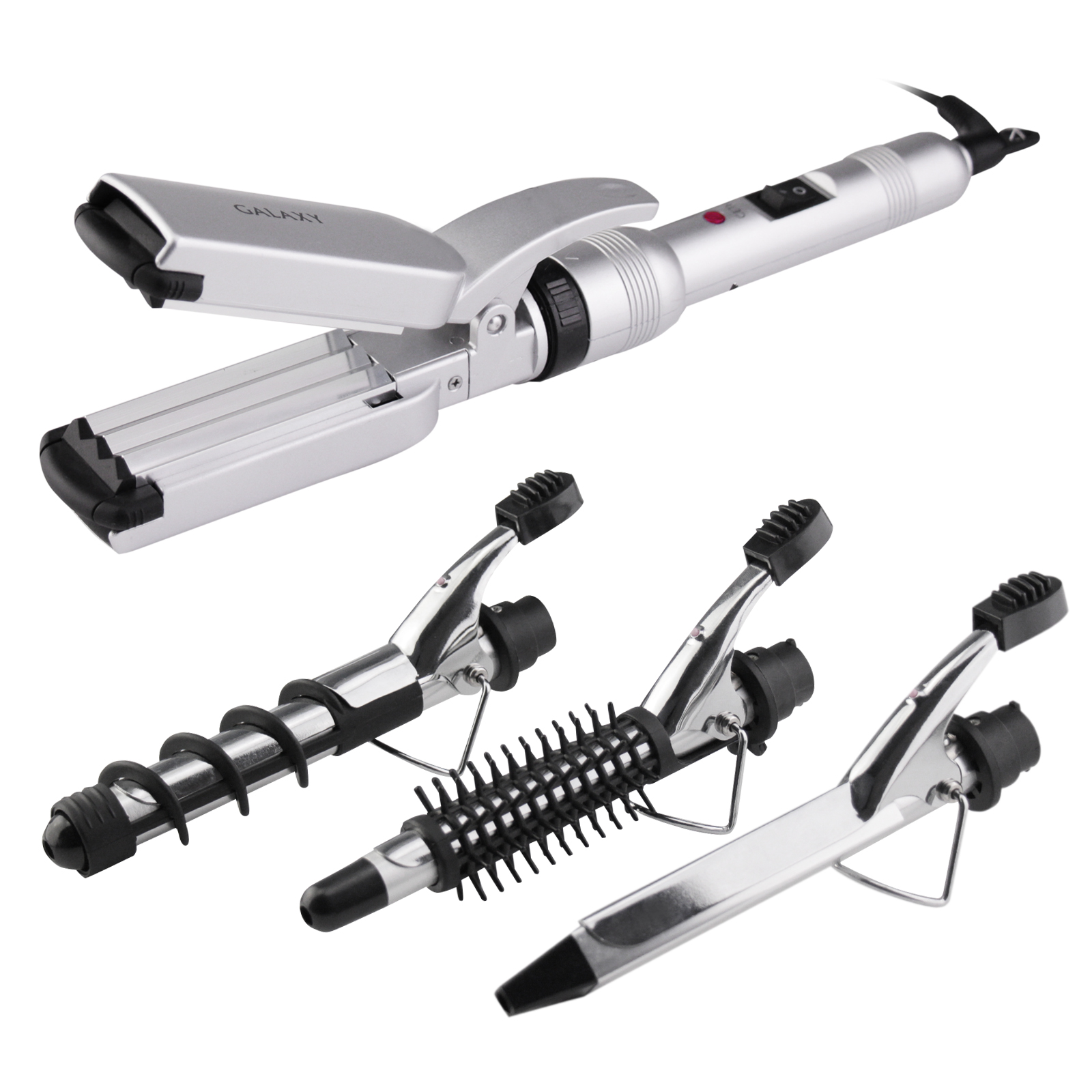 Набор GALAXY GL4701 имеет усовершенствованную систему фиксации насадок, быстро нагревается и бережно относится к волосам.
