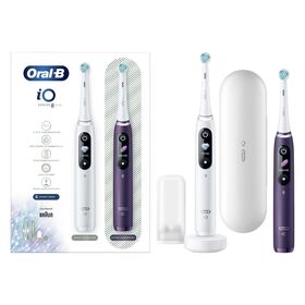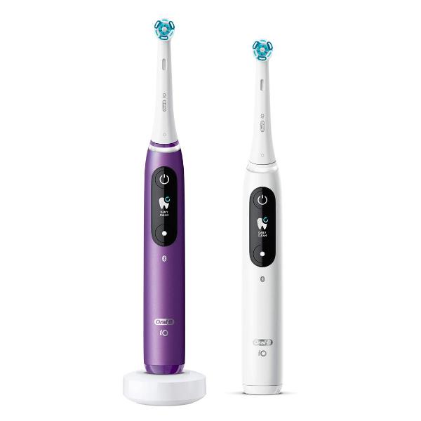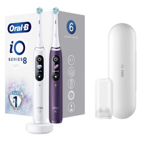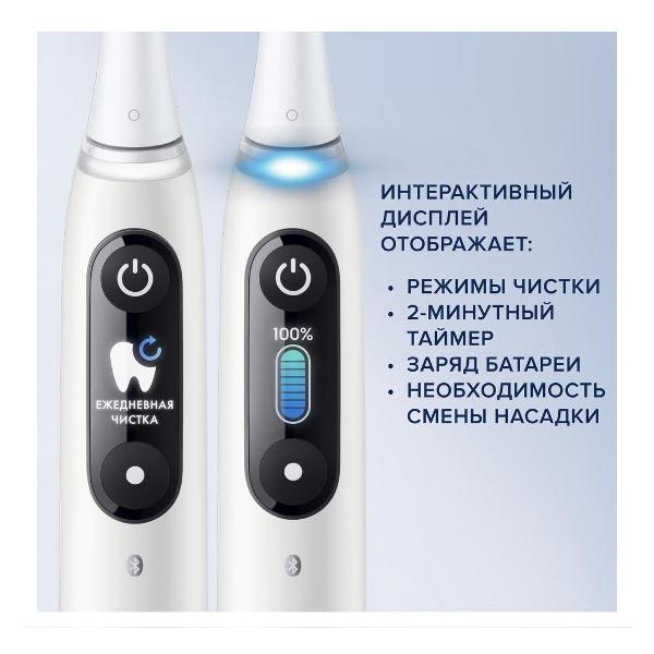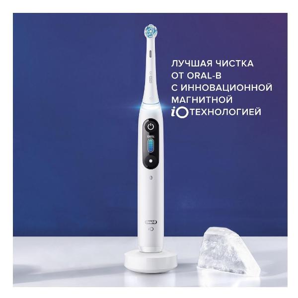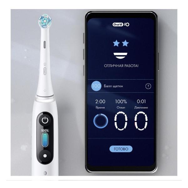 Электрическая зубная щетка Oral-B iO Series 8 Duo белого цвета обладает массой 387 г. В комплекте поставляется зарядное устройство. У модели водонепроницаемый корпус. Длина сетевого кабеля — 1 м. Время непрерывной работы — до 50 минут. Питание осуществляется от аккумулятора. На лицевой стороне размещаются индикаторы степени зарядки, разрядки, необходимости замены насадки и области чистки.