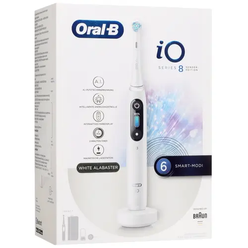 Датчик давления контролирует силу нажатия и помогает предотвратить кровоточивость десен. Аккумулятор гарантирует продолжительную автономность – до 48 минут в непрерывном режиме. В комплекте с Braun Oral-B iO8 Sonder-Edition поставляются устройство зарядки с магнитным креплением, подставка и футляр.