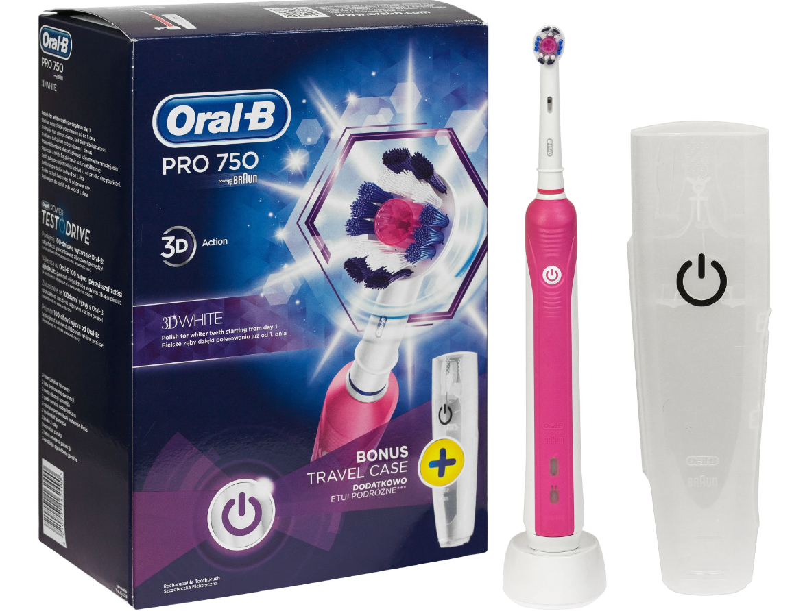 Электрическая зубная щетка Oral-B Pro 750, сменная насадка 3D White - 1 шт, дорожный футляр, зарядное устройство SmartPlug
