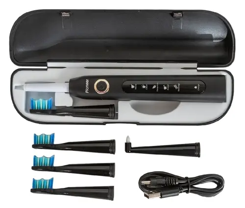 Комплектация: зубная щетка, дорожный футляр, USB кабель, сменные насадки, инструкция на русском языке