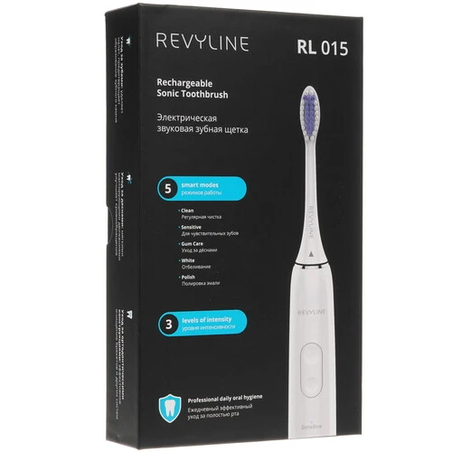 Прибор Revyline RL 015 оснащен пятью режимами, включающими деликатную, чистку с отбеливанием и массажем. Идущие в наборе насадки дополнены цветными маркерными пометками. Звуковая модель действует со скоростью 40000 пульсаций в минуту.