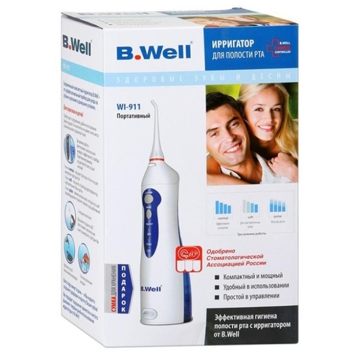 B.Well WI-911 — портативный ирригатор с встроенным аккумулятором, выполненный в эргономичном дизайне. Он значительно упрощает процесс ухода за полостью рта дома и во время путешествий, а также служит действенной профилактикой заболеваний дёсен и кариеса.