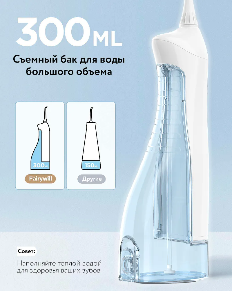 Большой резервуар для воды на 300 мл обеспечивает достаточную и бесперебойную чистку зубов.