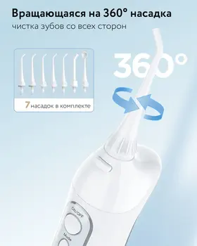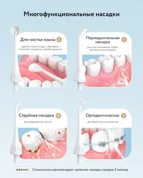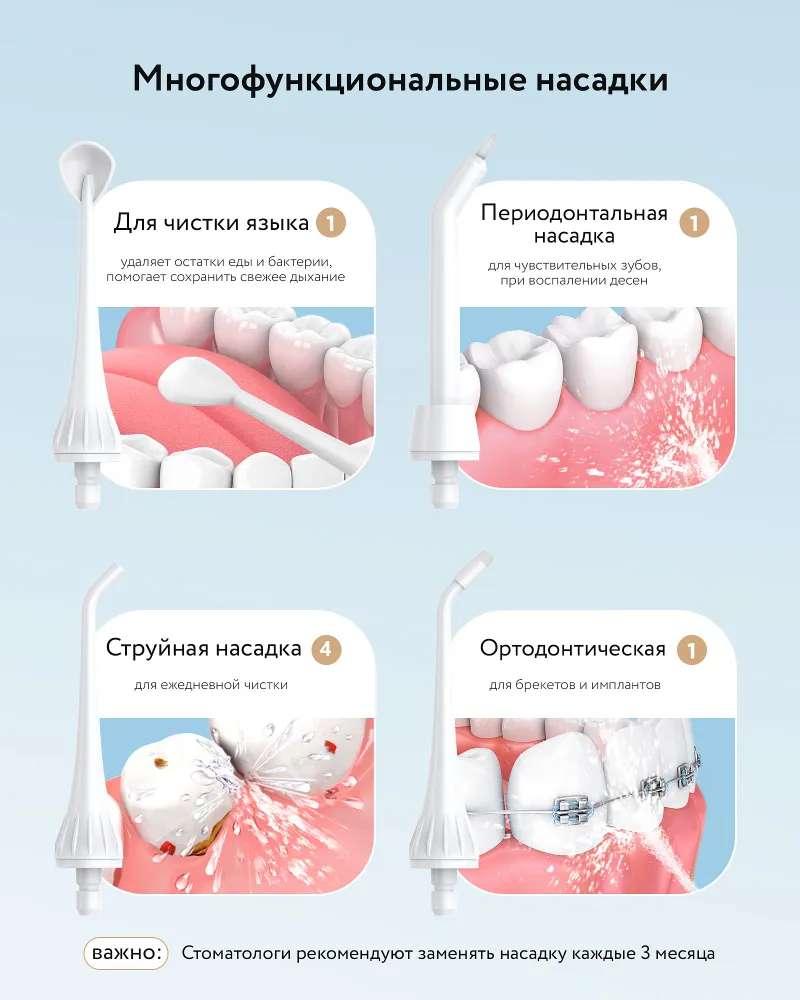 7 наконечников идут к комплекте: 4 стандартных + насадка для брекетов, насадка для языка, пародонтальная насадка (при воспалении десен и чувствительности зубов). Конструкция сопла, вращающегося на 360°, позволяет легко очищать труднодоступные внутренние части и предотвращает образование мусора и зубного налета.