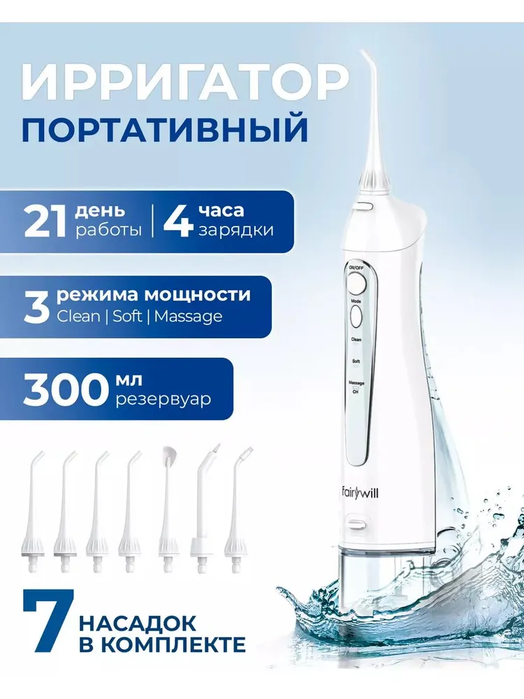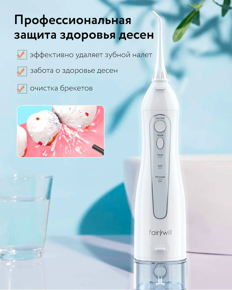 -чистый. С помощью сильных импульсов воды 1800 раз / мин для удаления более мелких частиц между зубами;