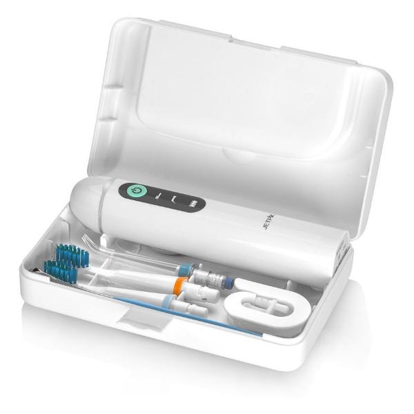 Ирригатор Jetpik JP200 Ultra имеет компактные размеры. Прибор работает от аккумулятора, на полную подзарядку которого уходит 8 часов. В наборе пять насадок. Конструкцией предусмотрен специальный отсек для их хранения. Корпус водонепроницаемый, выполнен из пластика. Материал легкий, прочный, долговечный, не боится механических повреждений, пыли и влаги, сохраняет изначальные свойства на протяжении всего срока службы изделия. Принцип работы устройства - импульсный. Объем резервуара для воды - 0,2 л.