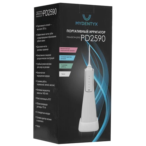 Ирригатор MYDENTYX PD2590 - это удобный и функциональный портативный прибор для полоскания полости рта и качественного очищения зубов. Ирригатор подойдет для тех случаев, когда зубная щетка не справляется с труднодоступными местами, а также для профилактики после каждого приема пищи.