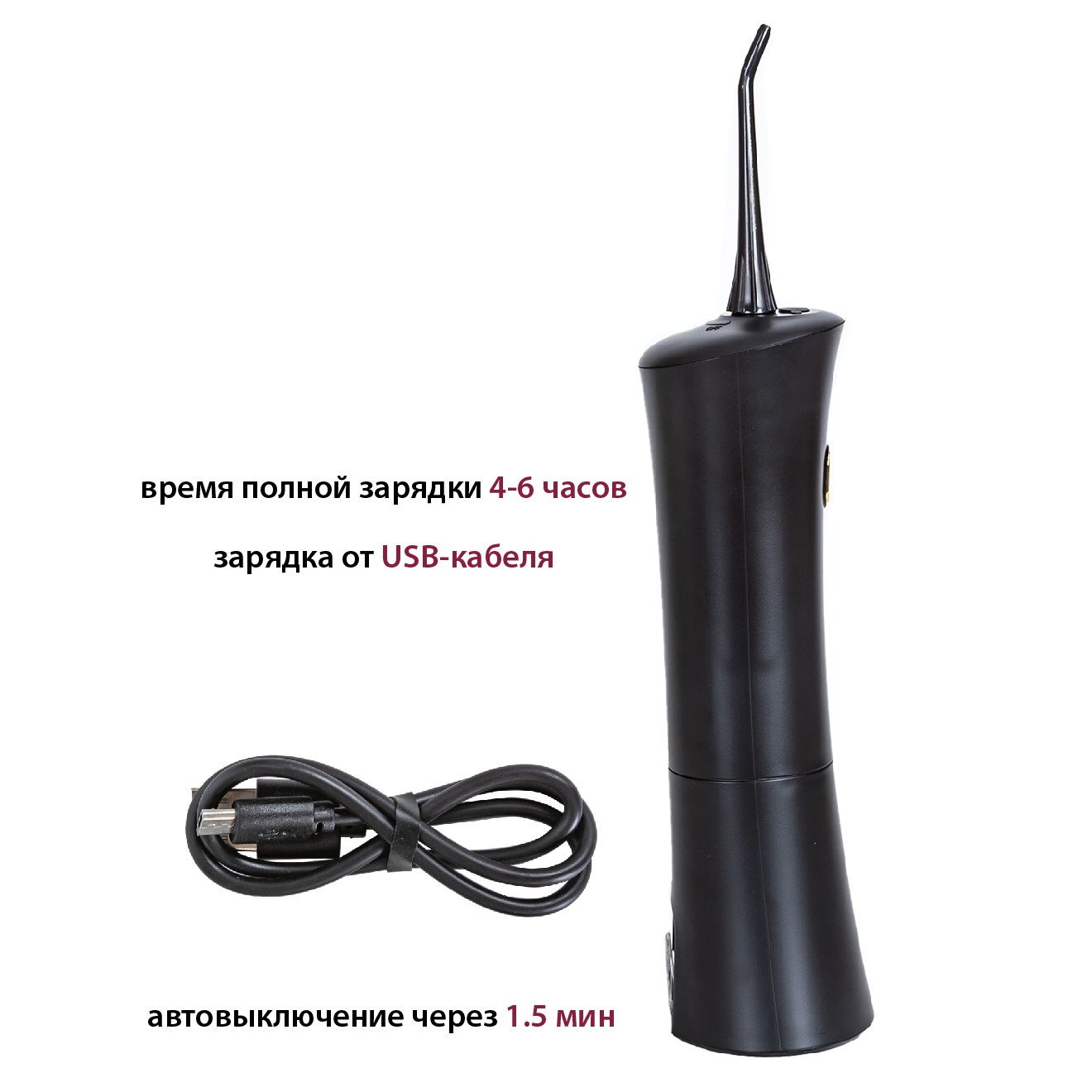 Комплектация: ирригатор, 2 стандартные струйные насадки, USB-кабель для зарядки батареи
