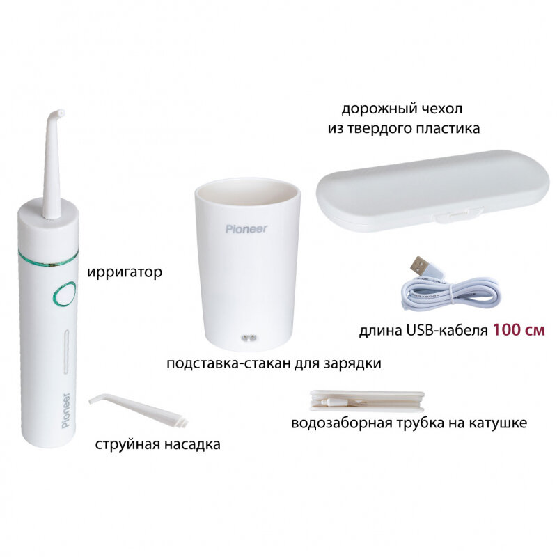 Ирригатор PIONEER HOME Pioneer TI-1010Компактный ирригатор Pioneer TI-1010 идеально подходит для чистки виниров, имплантов, протезов, брекет-систем и мостов. Удаляет бактерии, налет и остатки пищи даже из самых труднодоступных мест между зубами и деснами. Ирригатор может использоваться практически с любой емкостью для воды (встроенного резервуара для воды у него нет). Для этого он оснащен водозаборной трубкой с надетой на нее катушкой/грузом. Во время хранения трубку можно намотать на эту катушку.