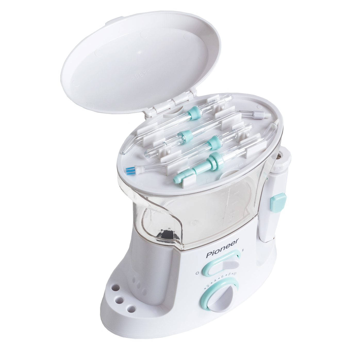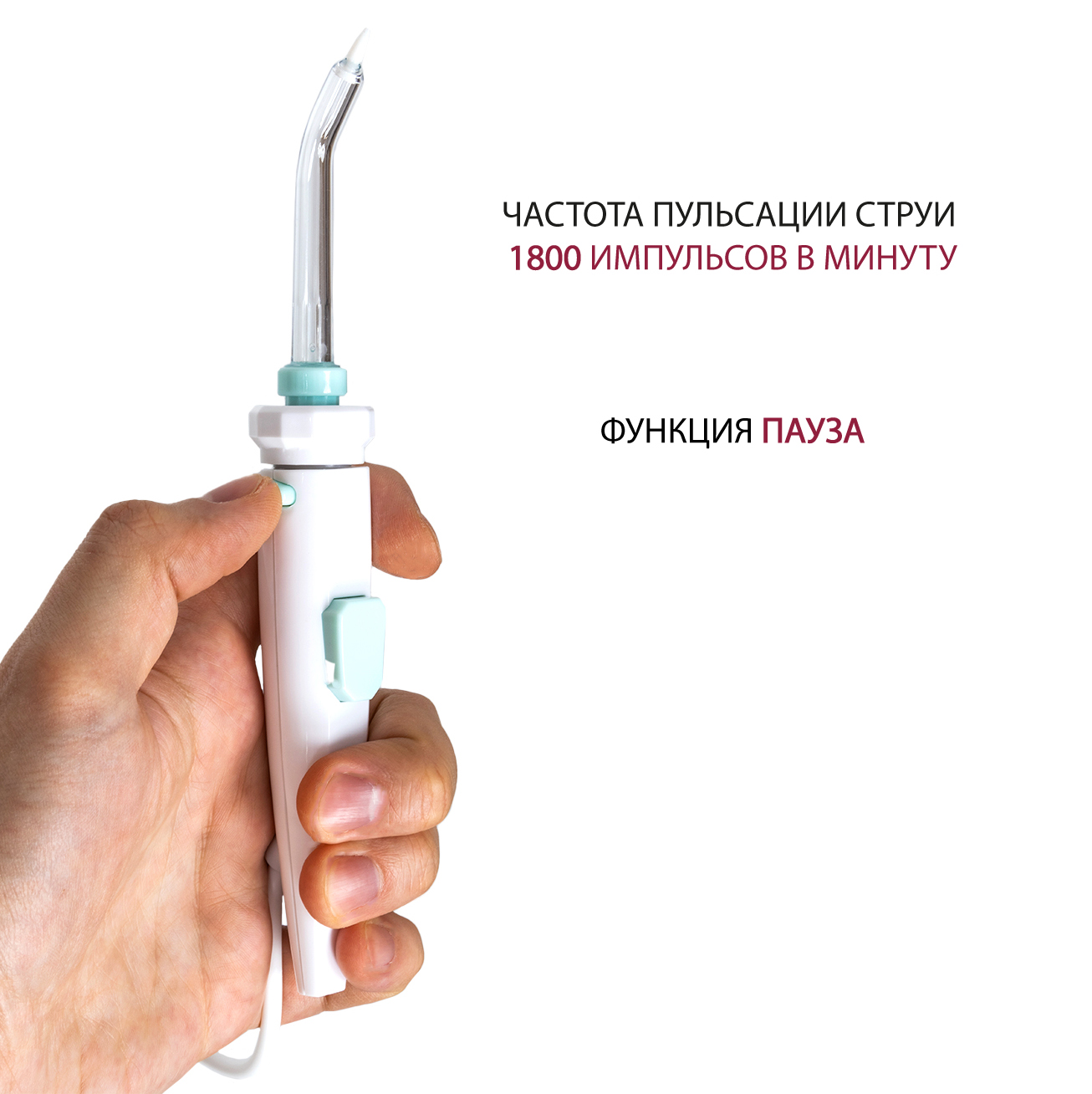На ирригаторе удобно расположена кнопка паузы, позволяющая в любой момент остановить процедуру. Под крышкой корпуса распложен отсек для компактного хранения насадок.