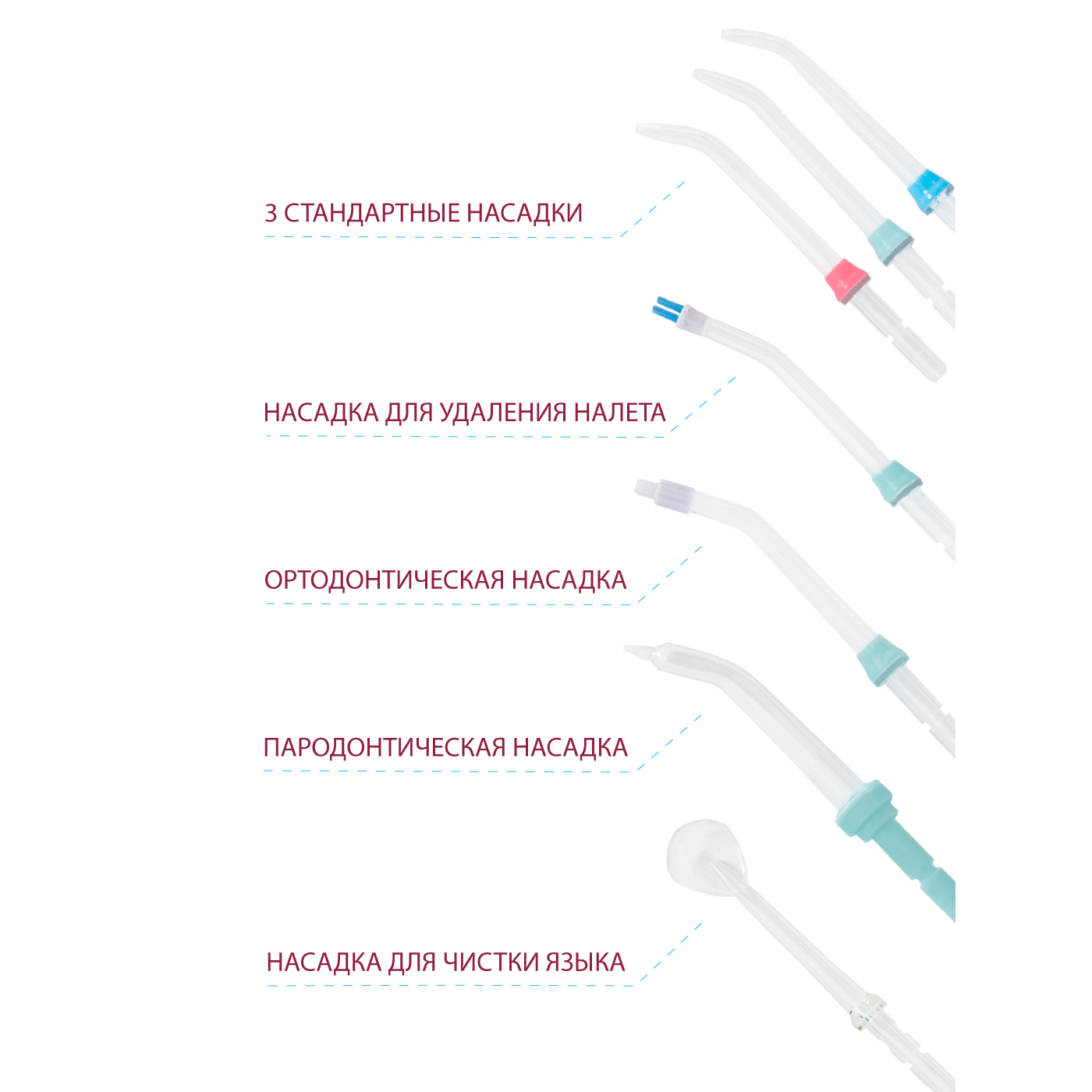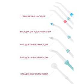 Насадки: 3 стандартные насадки с разными цветовыми кольцами, пародонтическая насадка, ортодонтическая насадка, насадка для удаления налета, насадка для очистки языка