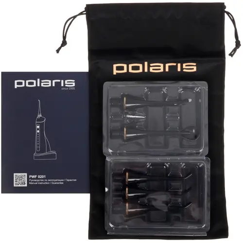 Polaris PWF 0201 идет в комплекте с пятью насадками для чистки зубов, языка, брекетов и протезов. Есть поддержка вращения на 360° для удобного и тщательного очищения труднодоступных участков и функция автоотключения. Устройство работает 100 минут от АКБ с емкостью 1500 мА∙ч и требует 24 часа для полной зарядки.