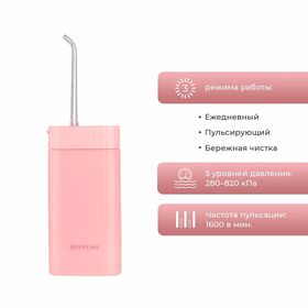 Ирригатор Revyline RL 410 Pink отличается компактными размерами. Принцип работы прибора - импульсный. Частота пульсаций струи варьируется в диапазоне от 1200 до 1600 имп/мин. Ирригатор запитывается от аккумулятора емкостью 1100 мА*ч. Время подзарядки - 4 ч. Объем резервуара для воды - 140 мл. Корпус водонепроницаемый, выполнен из пластика. Материал легкий, долговечный, износостойкий, не подвержен повреждениям, не деформируется в процессе эксплуатации, не боится неблагоприятного воздействия окружающей среды. В комплекте с прибором поставляются четыре насадки.
