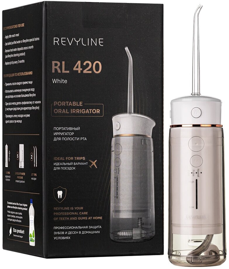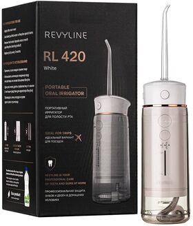 Основной блок ирригатора Revyline RL 420; Стандартная насадка – 2 шт; Выдвижной резервуар; Кабель USB; Инструкция по эксплуатации