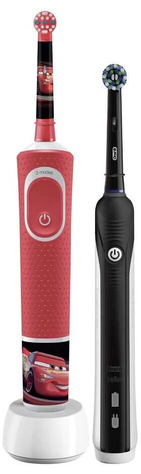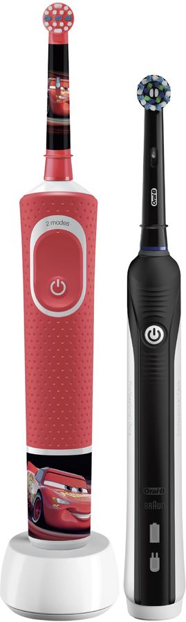 Превосходная чистка для всей семьи. В набор входит две щетки: Взрослая электрическая зубная щетка Pro 1 Black помогает вам чистить зубы в течение 2 минут благодаря встроенному таймеру. Детская электрическая зубная щетка Oral-B Kids для детей от 3 лет эффективный бережный уход за полостью рта.