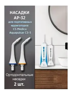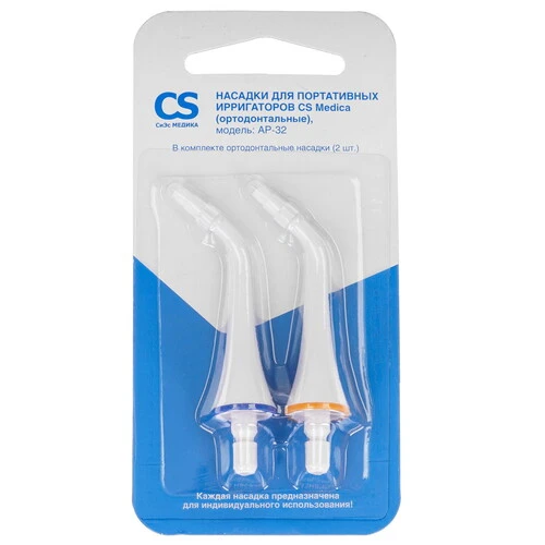 Набор сменных насадок CS Medica AP-32 состоит из 2 изделий, которые предназначены для использования с ирригатором. Каждое из них рассчитано на индивидуальное использование. Изготовлены ортодонтальные насадки CS Medica AP-32 из мягкого пластика.