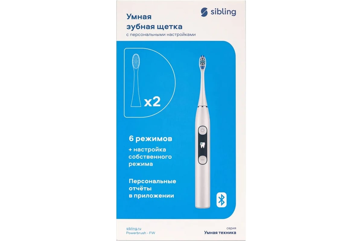 Ультразвуковая зубная щетка с персональными настройками использует фирменную ультразвуковую технологию очистки. За одну минуту данная модель создает до 50 000 вибрирующих и выметающих движений, а после применения прибор легко установить на зарядную станцию. Доступно 6 рабочих режимов и настройка собственного режима, а так же персональные отчеты в мобильном приложении Sibling и 5 цветов подсветки.
