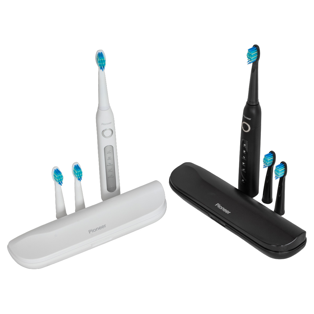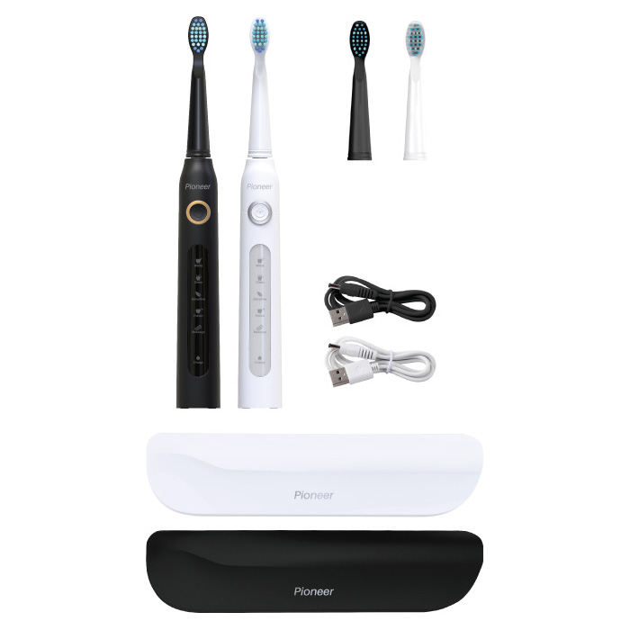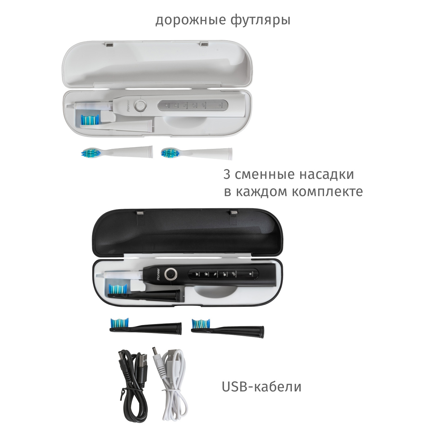 КОМПЛЕКТ электрических зубных щеток для двоих Pioneer TB-5000 с водонепроницаемым корпусом IPX7, 3 сменными насадками в каждом комплекте, двумя USB кабелями и двумя дорожными футлярами. Она удаляет бактерии, налет и остатки пищи даже из самых труднодоступных мест между зубами и деснами, а также подходит для чистки языка.